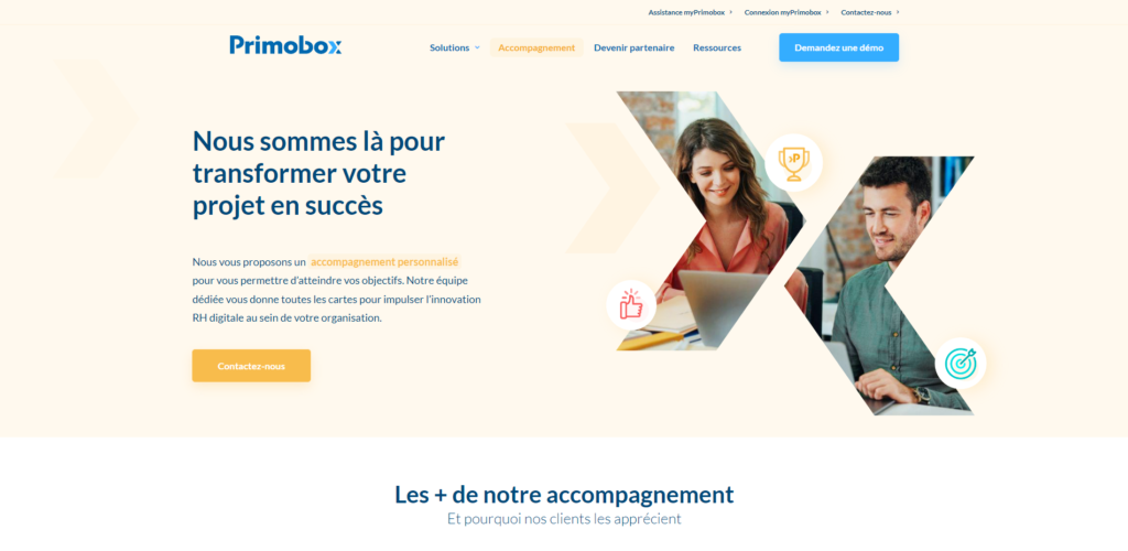 Nous avons également accordé une place centrale à notre démarche d'accompagnement client. Chez Primobox, nous mettons tout en œuvre pour transformer les projets de nos clients en succès avec une réelle politique de conduite du changement RH. Les grandes étapes du suivi que nous proposons à nos clients y sont détaillées pas à pas.