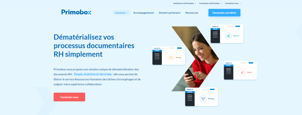 Pour cela, nous avons commencé par simplifier la présentation de notre solution. Notre objectif : que nos visiteurs comprennent en un coup d'œil comment elle peut simplifier leur quotidien et leur permettre d'atteindre leurs objectifs. Sur la page consacrée à la plateforme DEMAT RH et à l'espace personnel myPrimobox, nous avons opté pour des captures d'écrans accompagnées de textes synthétiques. Chaque fonctionnalité est détaillée sur une page dédiée ce qui nous a permis de renforcer la clarté et la transparence de notre offre.