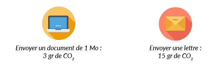 Selon les calculs de l’Ademe, (Agence de l’environnement et de la maîtrise de l’énergie), envoyer un document de 1 Mo à une personne émet environ 3 grammes de CO2. En comparaison, l’envoi d’une lettre prioritaire à une dizaine de kilomètres émet environ 15 grammes de CO2 selon La Poste.