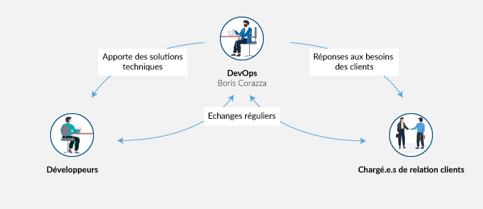 « Mon métier est assez transverse. Je travaille principalement avec deux pôles : les Chargés de relation clients et les Développeurs. Je participe tous les jours aux mêlées des équipes de Développement. Ça me permet de savoir s’ils ont rencontré des difficultés en production qui peuvent potentiellement être liées à notre infrastructure. Si c’est le cas, mon rôle est de leur apporter des solutions. Même chose avec les CSM (Customer Success Managers), j’échange au maximum avec eux pour répondre aux besoins de nos clients.